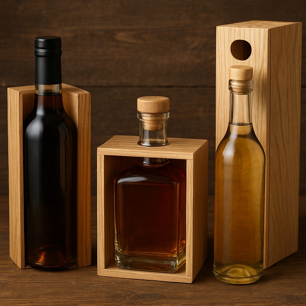 - Ręcznie wykonane skrzynki dębowe – często stosowane w limitowanych edycjach whisky lub win.